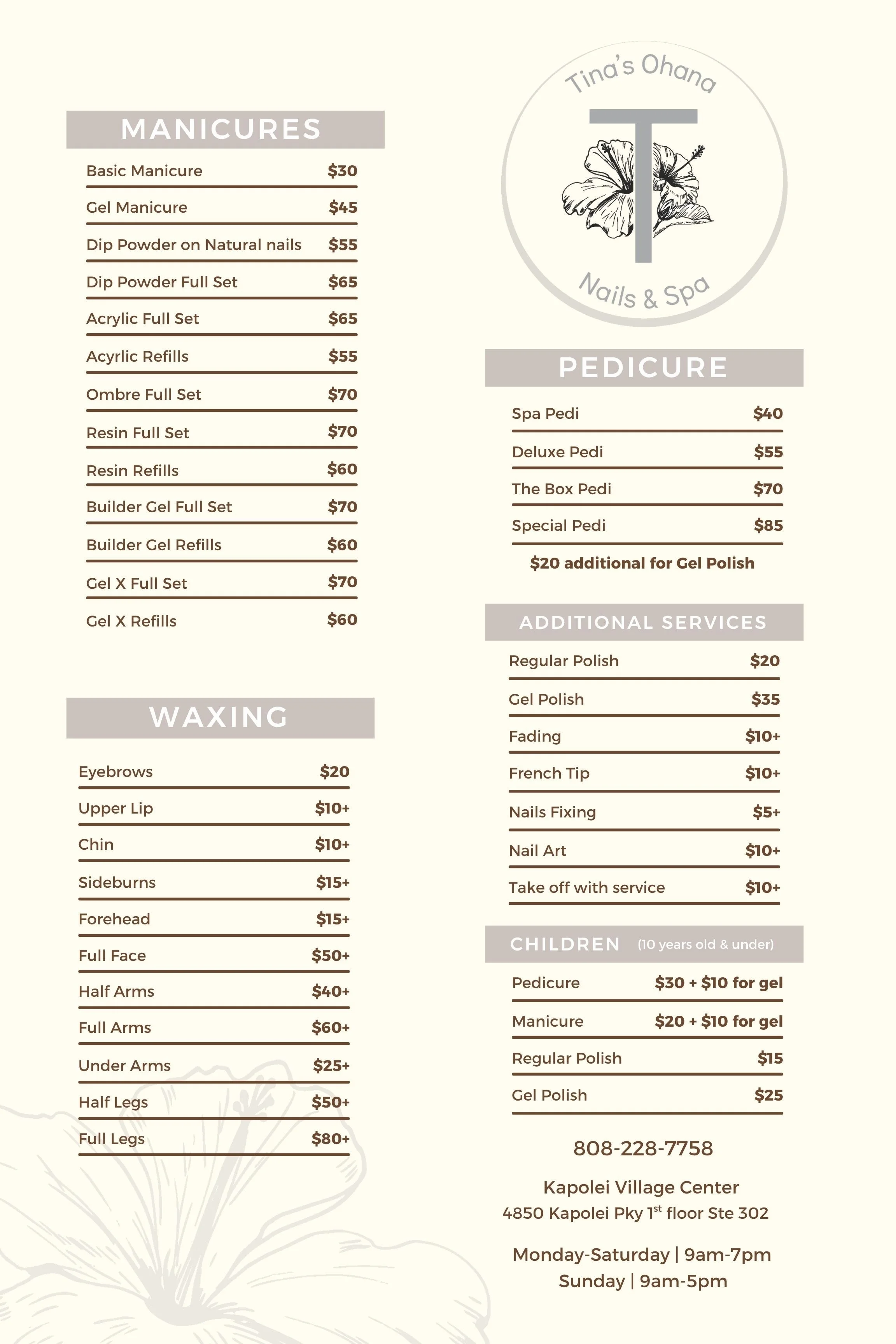 Contact us to schedule your appointment or drop by for walk-in service — we look forward to welcoming you to Tina's Ohana Nails & Spa at Kapolei Village Center!